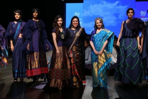 The sky over our head is the biggest assurance to preserving all that nature has given us. Handloom is an outcome of the beautiful climate mix and to be in gratitude to nature we dedicate our collection to it wholeheartedly. Mother-Daughter duo Sharmila Tagore and Soha Ali khan enhance and sparkling the ramp. Sharmila looked very dapper in a Mekhla Chadar, and Soha was graceful and stylish in a lehenga.